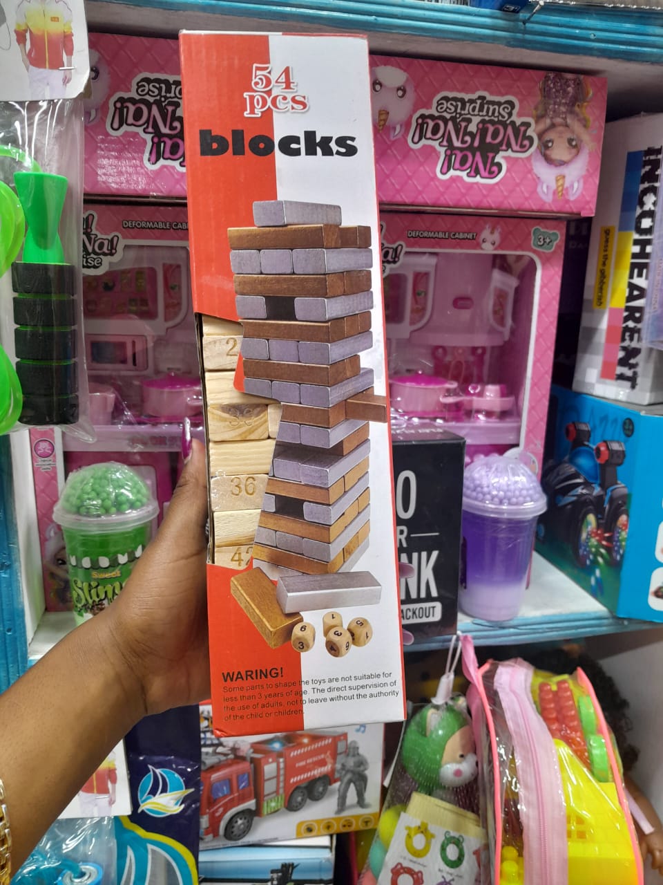 !The original wood block game. The rules are simple enough for the whole family to play: just stack the blocks into a tower without letting it fall! But it’s fun for all ages, too, as some blocks from the bottom of the tower are pulled to make it taller! Who will make the tower fall’ For any number of players. Contents: 54 genuine hardwood blocks