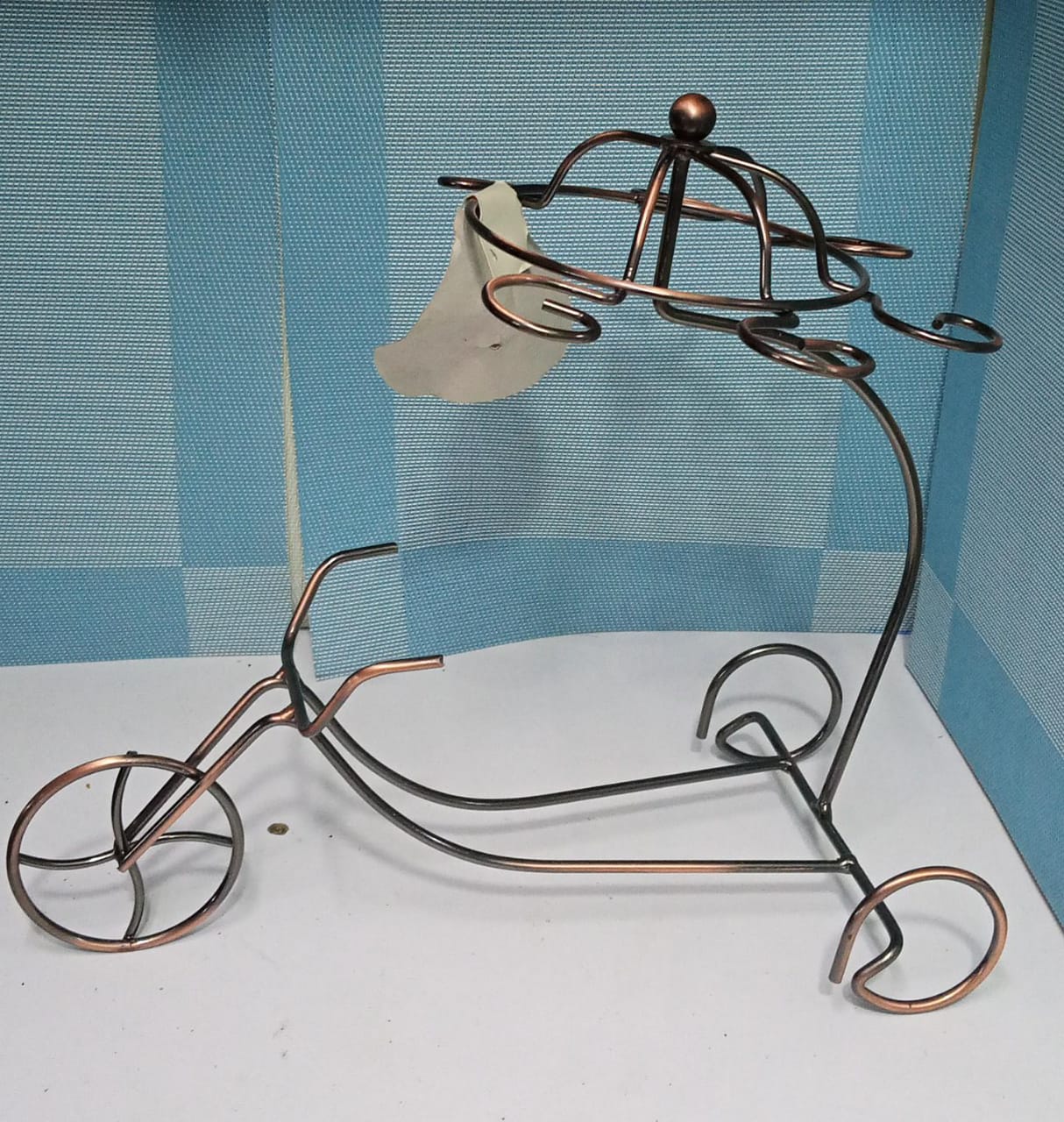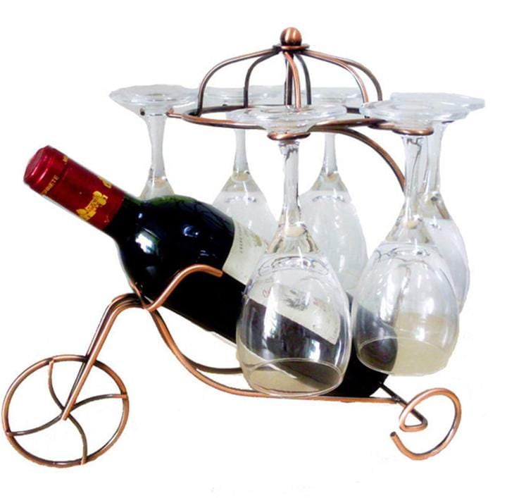 Wine glass and bottle holder bicycle. Made of material, durable, eco-friendly and safe to use. Elegant wire tricycle shape craft design, stable. Holds 6pcs wine glasses